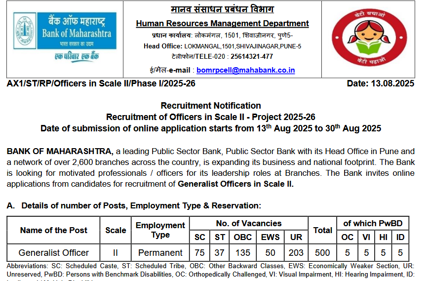 Bank of Maharashtra has published government job notification for the post of Generalist Officer Grade II Recruitment 2025. The application process of Generalist Officer Grade II Recruitment 2025 is going on from 13 August 2025 to 30 August 2025. Candidates who meet all the eligibility criteria in the recruitment process can apply online.  More Other Recruitment | Jobs Online Form | Govt Scheme | Admission | Syllabus and Exam Pattern | Admit Card | Result | Answer Key All information can be obtained on govtfreejob : govtfreejob.com