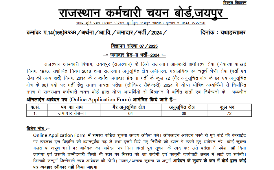 Rajasthan RSSB Jamadar Grade II Recruitment 2025 : Apply Online Form for 72 Post